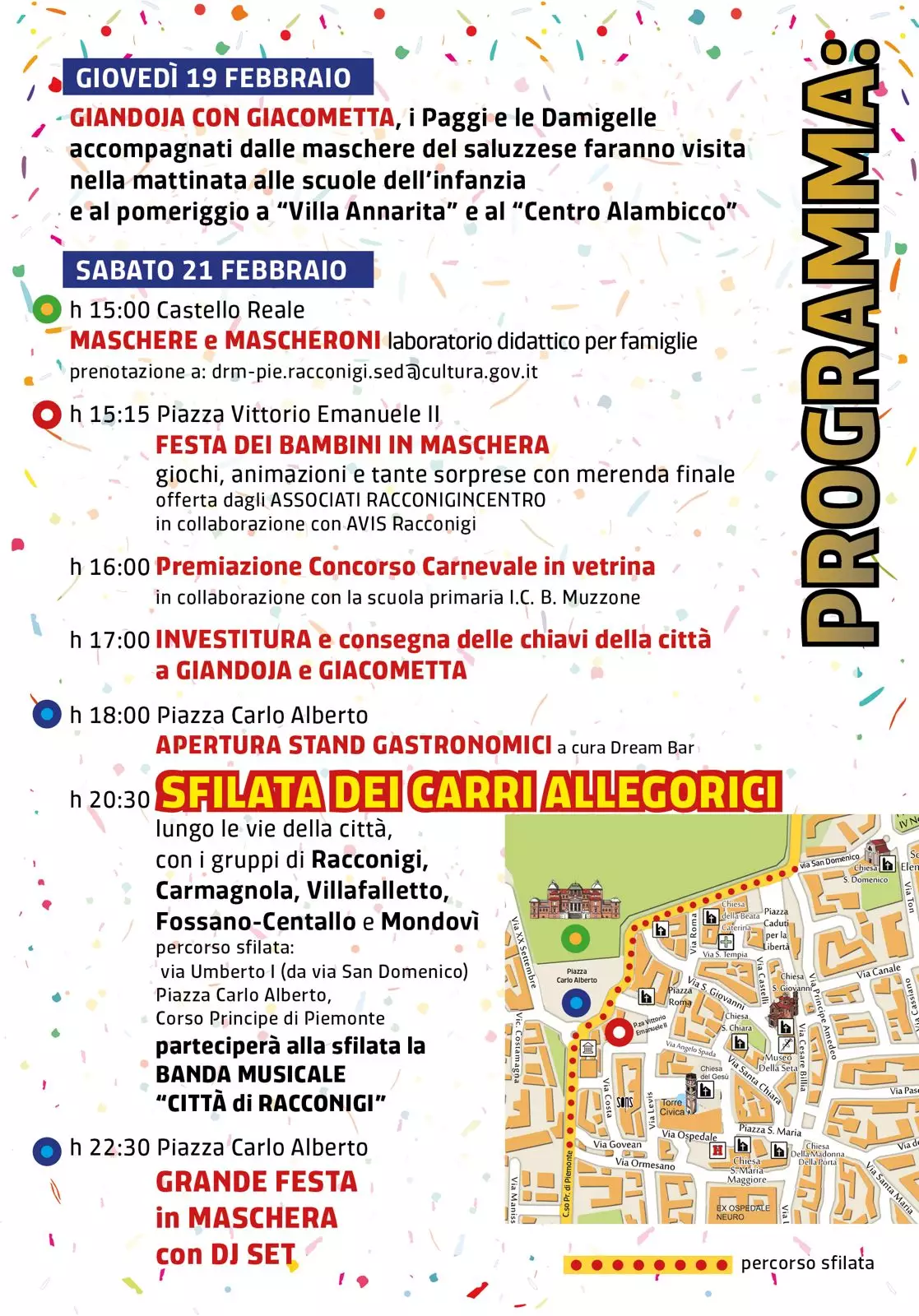Sabato 21 febbraio torna il 46° “Carlevè d'Racunis”: a partire dalle ore 15 il centro cittadino sarà animato da tanti eventi e iniziative per bambini e adulti, organizzati dalla Pro Loco Racconigi Attiva, il Comune e l’associazione Racconigincentro, in collaborazione con le scuole, la Direzione Regionale Musei e le maschere racconigesi Giandoja e Giacometta. Novità di quest’anno sarà il ritorno, dopo 15 anni, della sfilata per le vie della città con i carri.