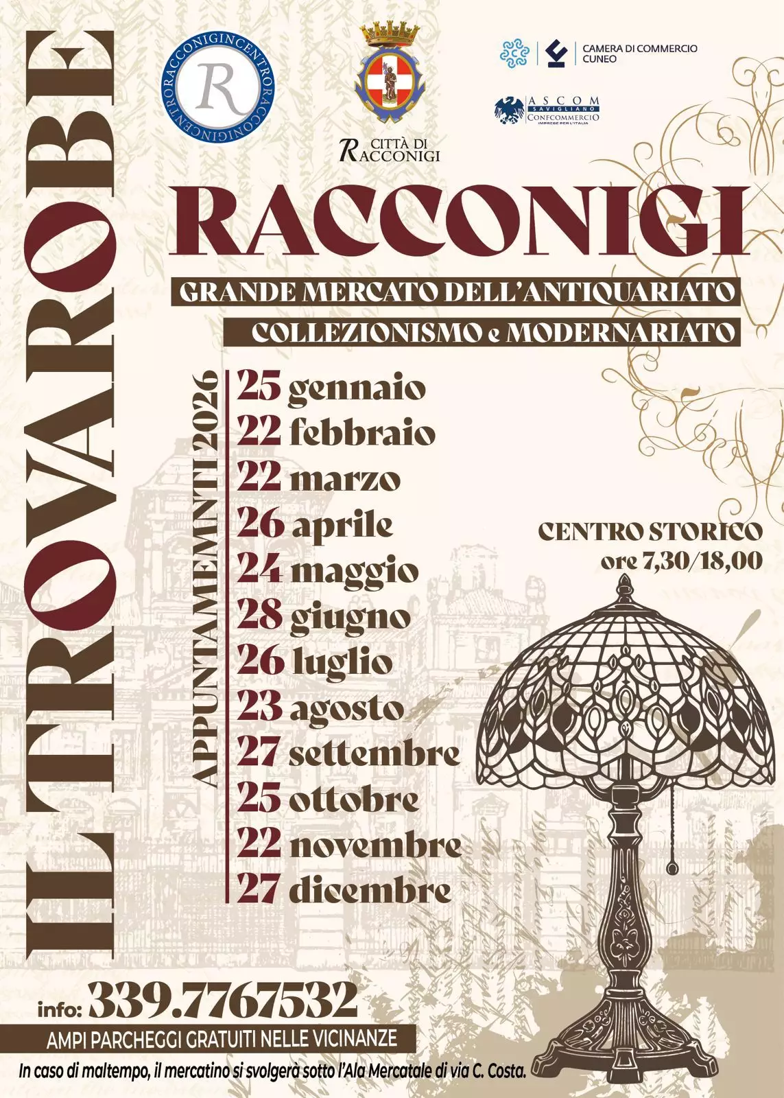 Gli altri appuntamenti con Il Trovarobe a Racconigi nel 2026 saranno i seguenti: 22 febbraio, 22 marzo, 26 aprile, 24 maggio, 28 giugno, 26 luglio, 23 agosto, 27 settembre, 25 ottobre, 22 novembre e 27 dicembre.