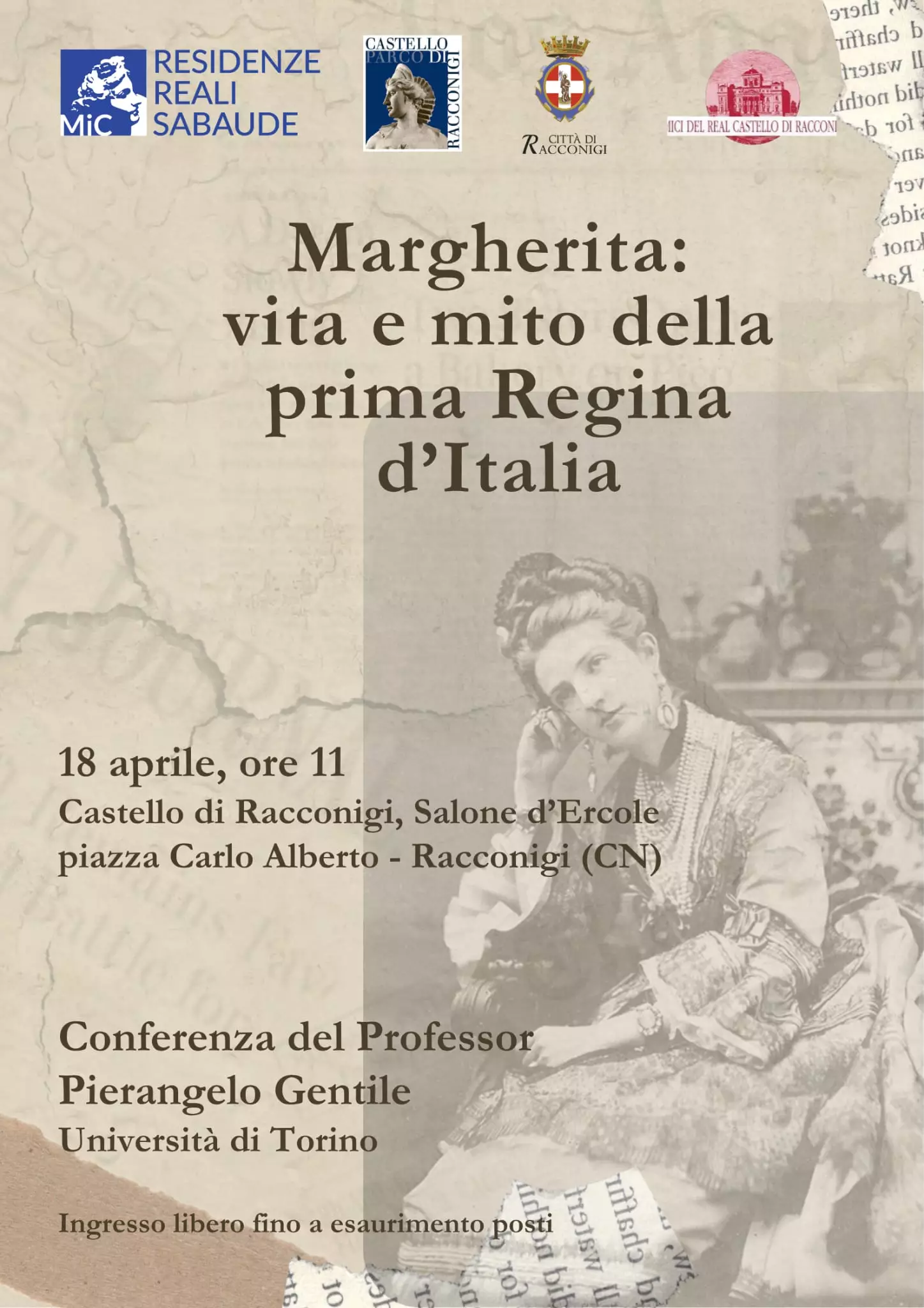 Sabato 18 aprile, alle ore 11, il Salone d’Ercole del Castello di Racconigi ospiterà la conferenza “Margherita: vita e mito della prima Regina d’Italia”, realizzata in occasione del centenario dalla morte di Margherita di Savoia. L’appuntamento è stato ideato e organizzato dall’associazione Amici del Real Castello di Racconigi, con la collaborazione del polo museale e del Comune.