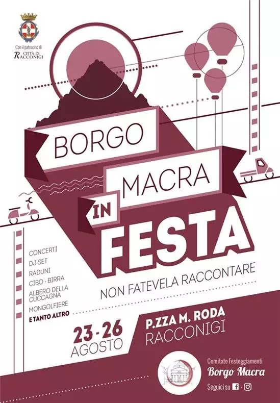 Dettaglio Borgo Macra in FestaNon fatevela raccontareDal 23 al 26 agosto Concerti - Dj setRaduniCibo - BirraAlbero della CuccagnaMongolfieree tanto altro ancora