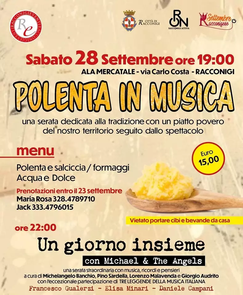 Prima del concerto, a partire dalle ore 19, l’associazione Racconigieventi propone una cena a base di polenta, un piatto povero ma ricco di storia, simbolo della cucina popolare del territorio: sarà un’occasione per riscoprire sapori autentici e condividere un momento di convivialità.