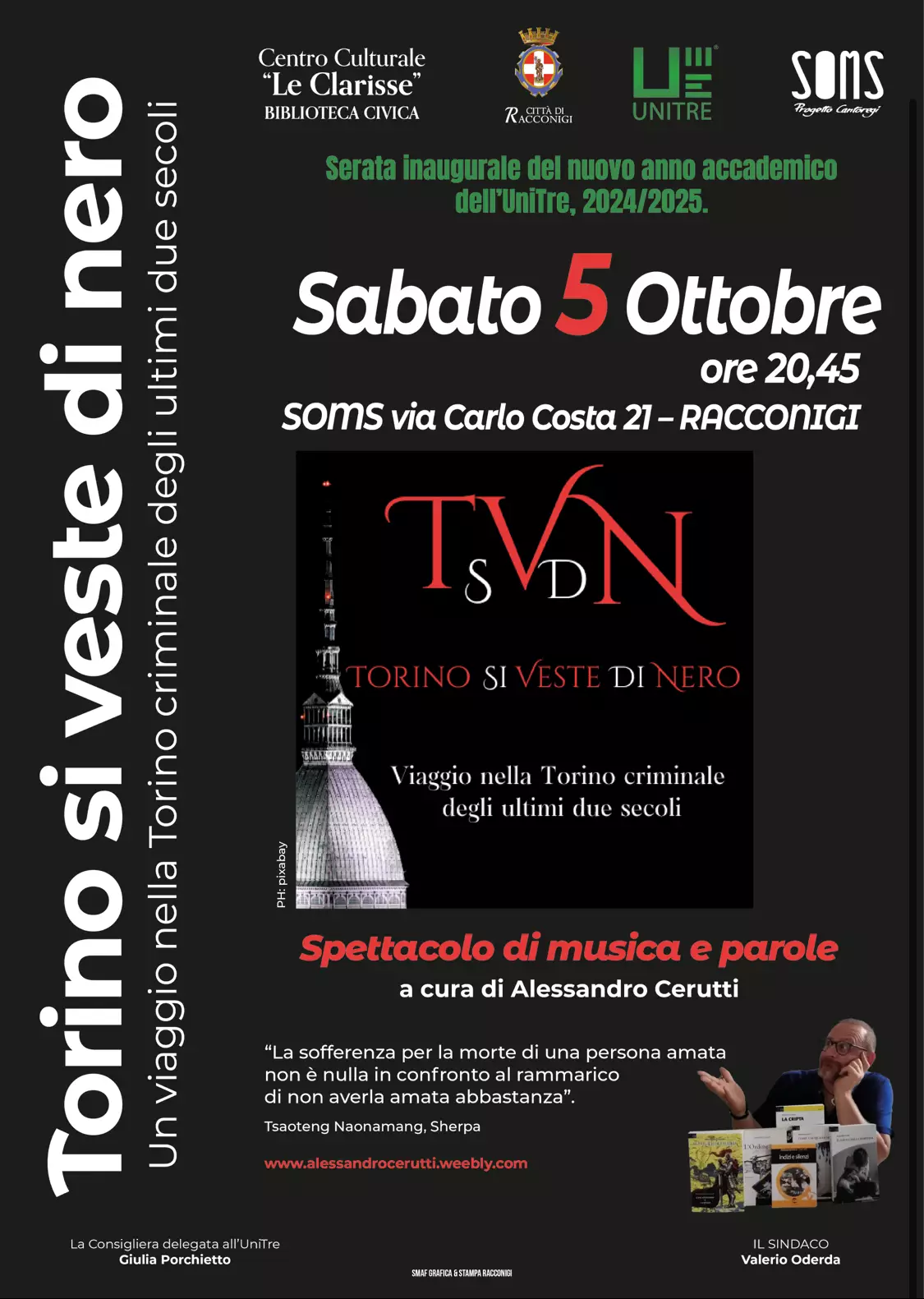 Sabato 5 ottobre, alle 20:45, la Soms di Racconigi ospiterà la cerimonia di inaugurazione dell’anno accademico 2024/2025 dell’Università per le tre Età (UniTre). Per l’occasione andrà in scena uno spettacolo di musica e parole dal titolo "Torino si veste di nero. Un viaggio nella Torino criminale degli ultimi due secoli", a cura dello scrittore, autore e performer Alessandro Cerutti.