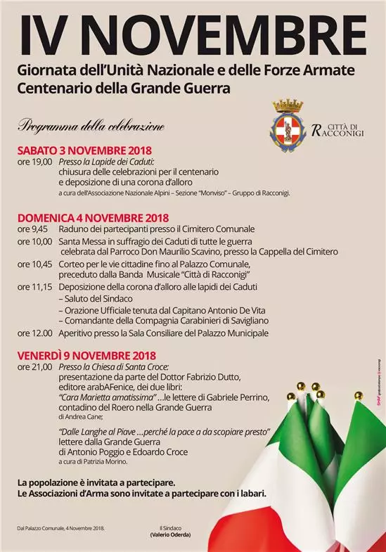 IV Novembre, giornata dell'Unità Nazionale e delle Forze Armate, Centenario della Grande Guerra.