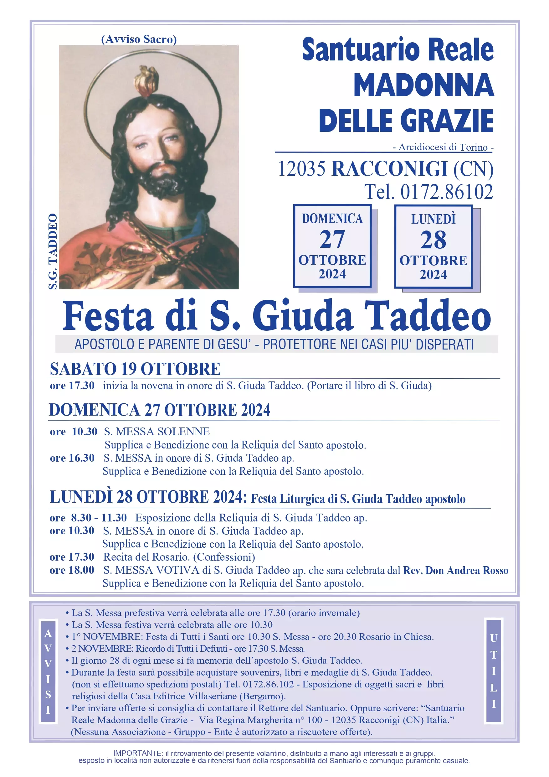 La tradizionale Festa di San Giuda Taddeo si terrà domenica 27 e lunedì 28 ottobre presso il Santuario Reale Madonna delle Grazie. La celebrazione, molto sentita dalla comunità locale, sarà un momento di preghiera e condivisione spirituale.