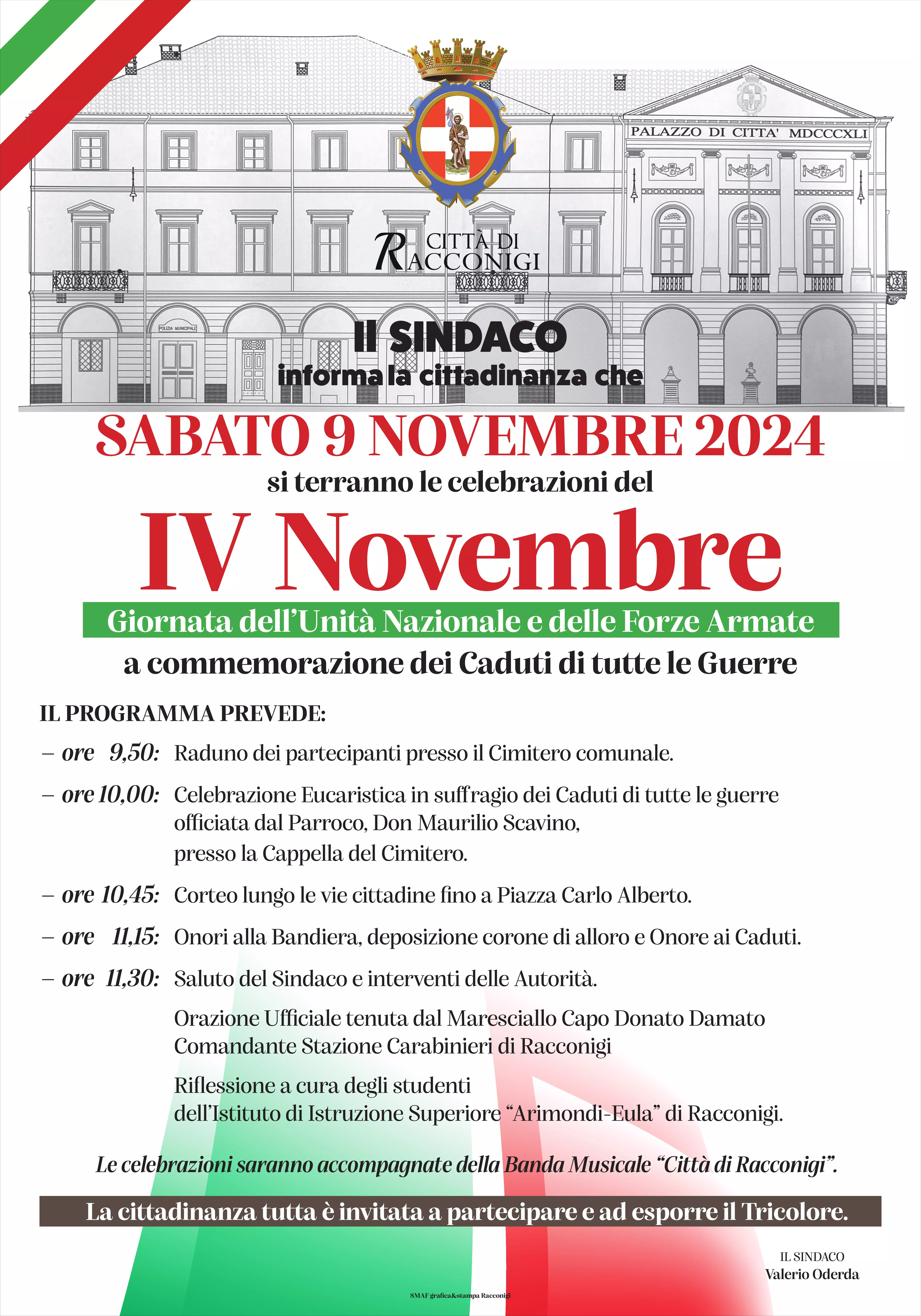 Sabato 9 novembre 2024 a Racconigi sono in programma le celebrazioni della Giornata dell’Unità Nazionale e delle Forze Armate, un momento di riflessione e di unità in ricordo dei caduti di tutte le guerre.