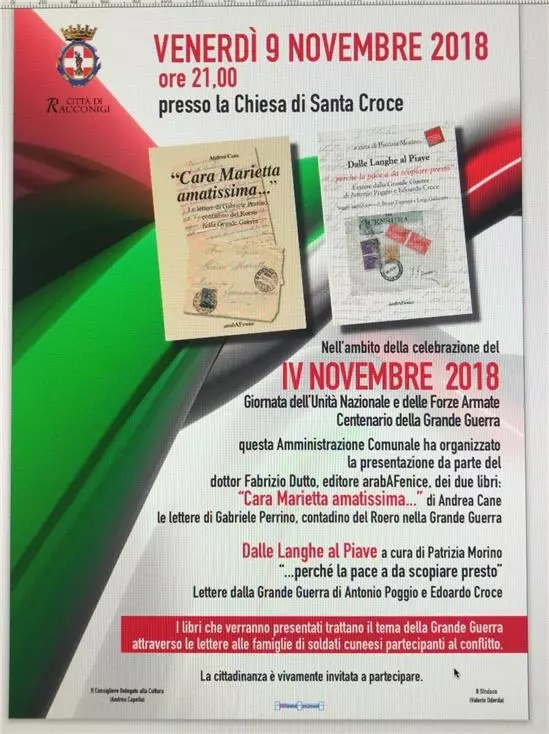 Nell'ambito della celebrazione del IV NOVEMBRE 2018, giornata dell'Unità Nazionale e delle Forze Armate, Centenario della Grande Guerra questa Amministrazione Comunale ha organizzato la presentazione da parte del dottor Fabrizio Dutto, editore arabAFenice, dei due libri: