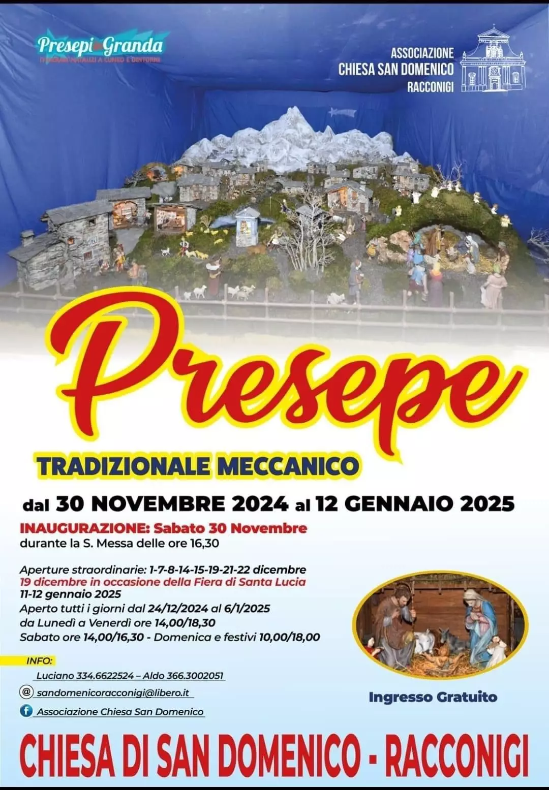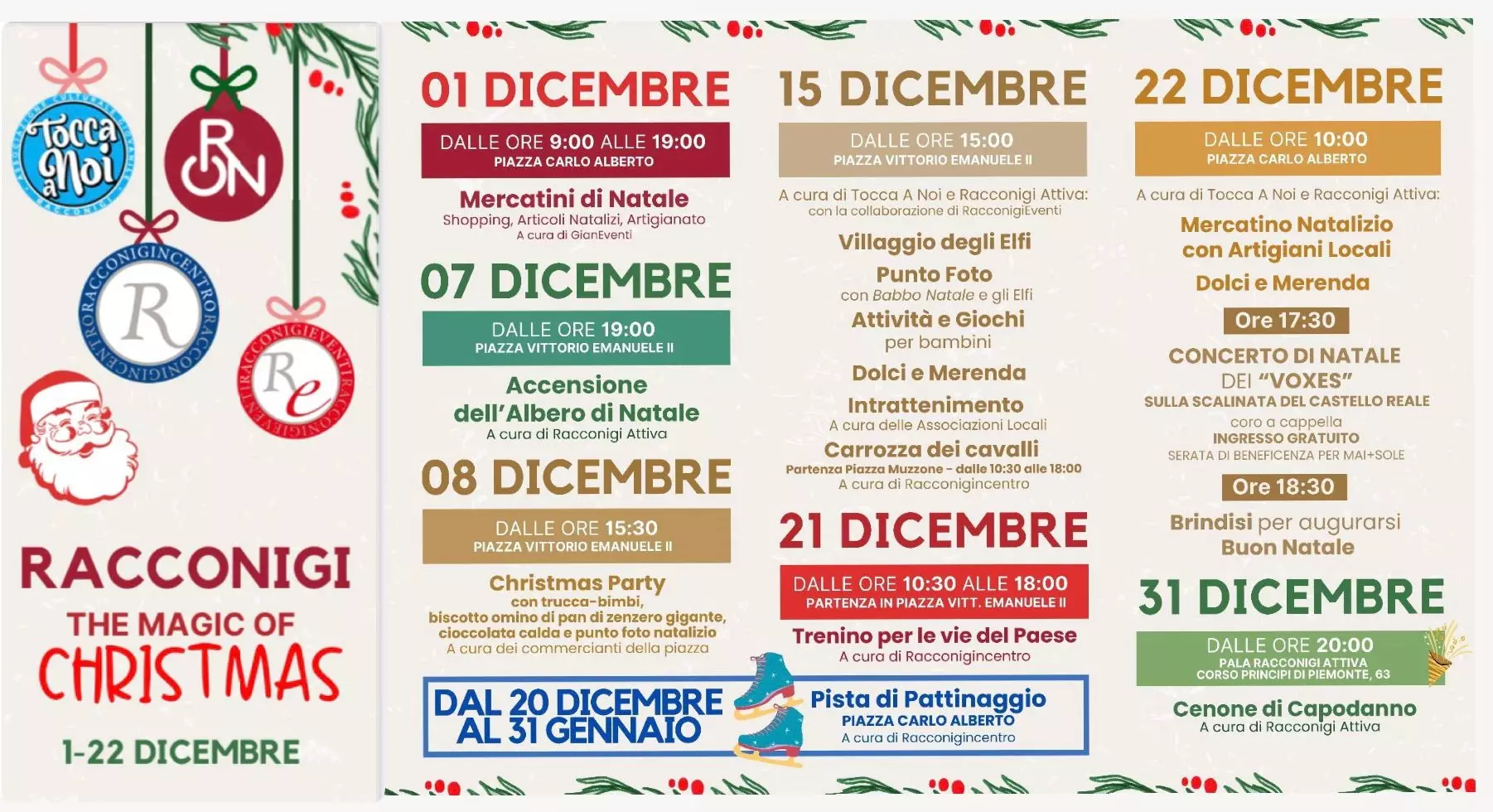 Il Natale a Racconigi si accende con un ricco programma di eventi e iniziative, organizzati grazie alla collaborazione tra le associazioni Racconigi Attiva, Racconigincentro, Racconigieventi, Tocca a Noi, Pinacoteca Civica Levis Sismonda, Museo della Seta, Associazione Chiesa San Domenico, i volontari del presepe di Racconigi, la Banda Musicale di Racconigi e la Corale le Verne.