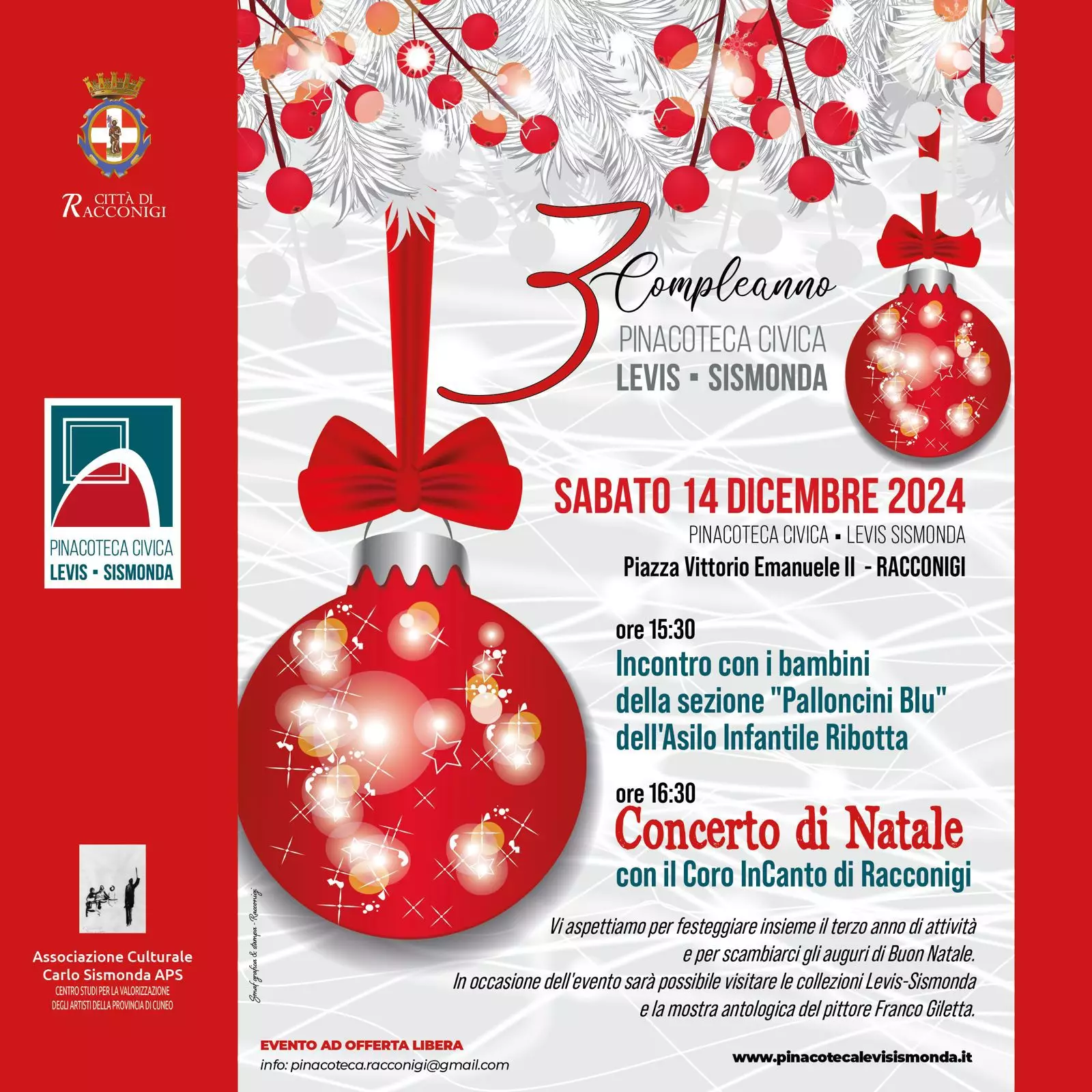 Un momento speciale sarà quello del 14 dicembre, quando la Pinacoteca Civica Levis Sismonda celebrerà il suo terzo compleanno: alle ore 15:30 i bambini dell’Asilo Ribotta, sezione Palloncini Blu, saranno protagonisti di un incontro speciale, mentre alle 16:30 il coro InCanto di Racconigi offrirà un emozionante Concerto di Natale. «Vi aspettiamo per festeggiare insieme il terzo anno di attività e per scambiarci gli auguri di buon Natale – fanno sapere dalla pinacoteca - In occasione dell'evento sarà possibile visitare le collezioni Levis-Sismonda e la mostra antologica del pittore Franco Giletta».