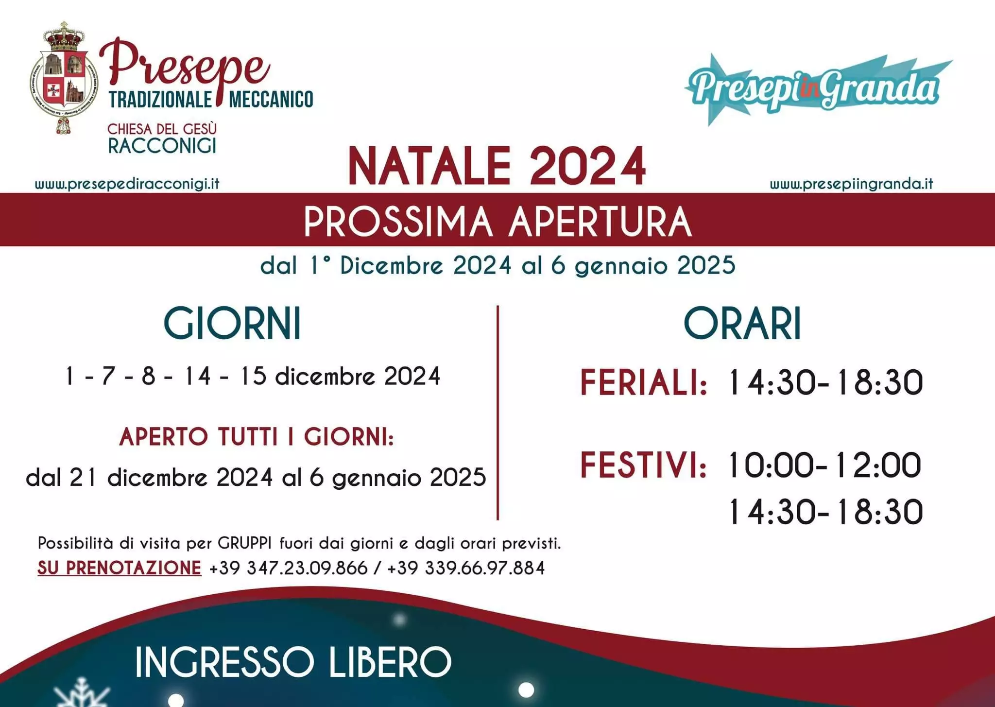 Il presepe meccanico della Chiesa del Gesù, invece, è accessibile dal 1 dicembre e aperto tutti i giorni dal 21 dicembre al 6 gennaio, con aperture speciali il 7, 8, 14 e 15 dicembre. Entrambi offriranno un’esperienza unica e suggestiva, perfetta per immergersi nello spirito del Natale.