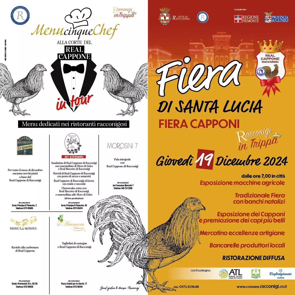 Il 19 dicembre è in programma invece la tradizionale Fiera di Santa Lucia, dedicata ai prodotti del territorio, in particolare al Real Cappone di Racconigi, alla trippa e alle altre De.Co cittadine Real Biscotto e mora di gelso. Per l’occasione la città si animerà con il mercatino delle eccellenze artigiane e dei produttori, oltre all’esposizione delle macchine agricole e dei capponi, con premiazione degli esemplari più belli. Per l’occasione i ristoratori e le attività del territorio offriranno menù speciali con protagoniste le eccellenze del territorio.