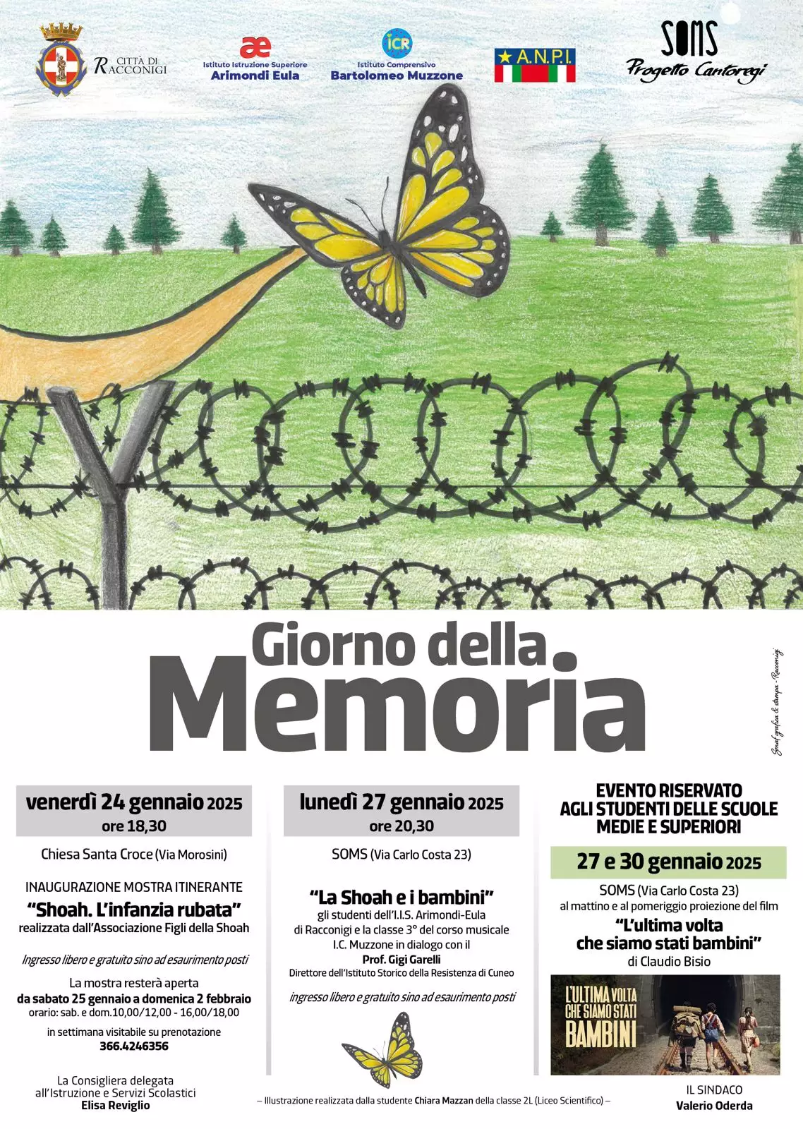 Lunedì 27 gennaio invece, alle ore 20:30, la Soms di via Carlo Costa ospiterà il professor Gigi Garelli, direttore dell’Istituto Storico della Resistenza di Cuneo, che dialogherà sul tema “La Shoah e i bambini”, con gli studenti dell’Istituto Arimondi Eula e con la classe terza del corso musicale dell’Istituto Muzzone. Ingresso libero e gratuito fino a esaurimento posti.