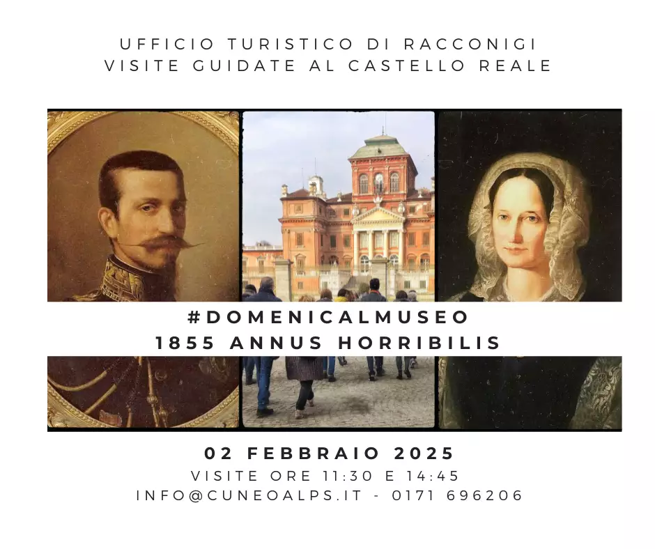 Il 2 febbraio, in occasione della #domenicalmuseo, l'Ufficio Turistico di Racconigi in collaborazione con le guide Cuneo Alps, propone una visita al Castello Reale di Racconigi arricchita da curiosità ed aneddoti legati ad uno specifico anno: il 1855. Esattamente 170 anni fa, la famiglia Savoia visse un anno straordinariamente difficile. Gennaio iniziò con la morte della Regina madre Maria Teresa d'Asburgo, moglie di Carlo Alberto, e proseguì con eventi nefasti: il decesso della giovanissima Regina e del Duca di Genova, fratello del Re, pochi giorni dopo. Una guerra era in corso e non pareva terminare voler terminare. Infine molti cattolici, quell'anno, si dimostrarono assai ostili al re Vittorio Emanuele II e non mancarono, in questi difficili frangenti, di farglielo pesare. Proprio nel 1855, il Castello di Racconigi, per la prima volta dopo anni di costante frequentazione, non fu meta delle villeggiature Reali. Da quell'anno la residenza restò nell'ombra per lungo tempo, lasciando un grande vuoto in città. La visita ci racconterà quindi dei personaggi protagonisti di quel 1855 e ci condurrà a scoprire spazi, ritratti, stati d'animo e ricordi di Vittorio Emanuele II.