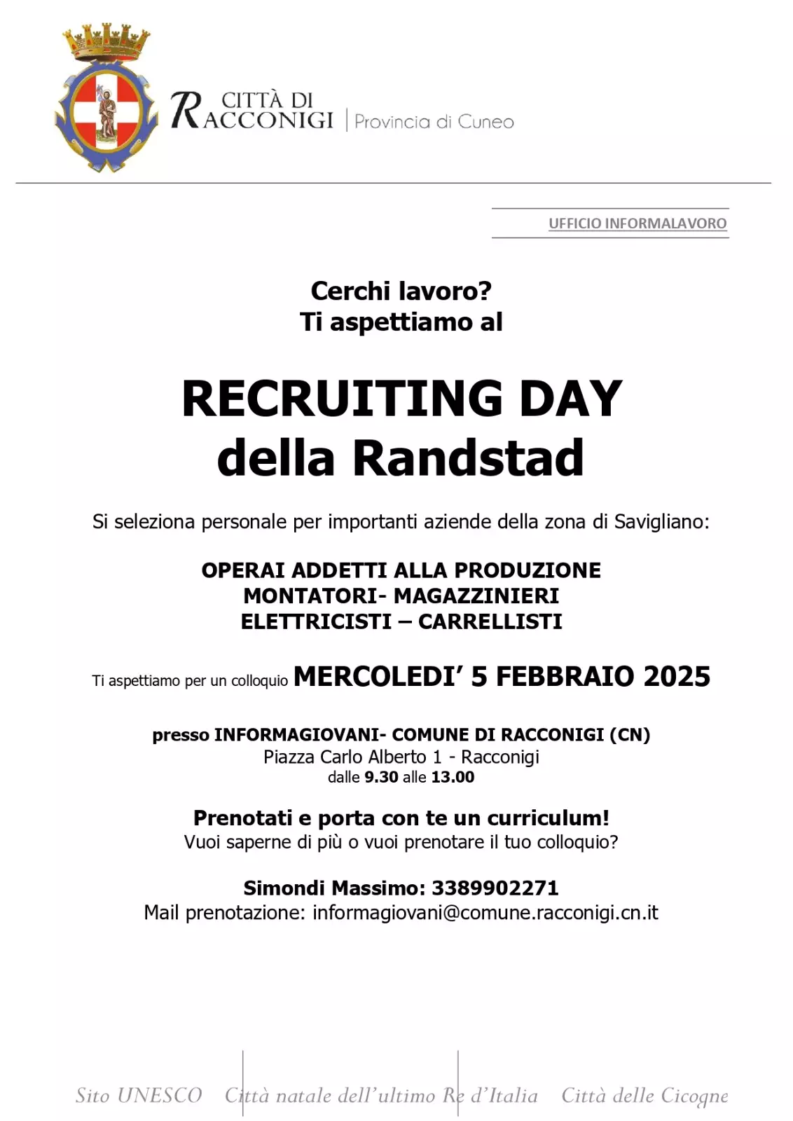 Mercoledì 5 febbraio, dalle ore 9.30 alle 13, lo sportello Informalavoro di Racconigi all’interno del municipio (piazza Carlo Alberto 1) ospiterà un recruiting day a cura di Randstad.