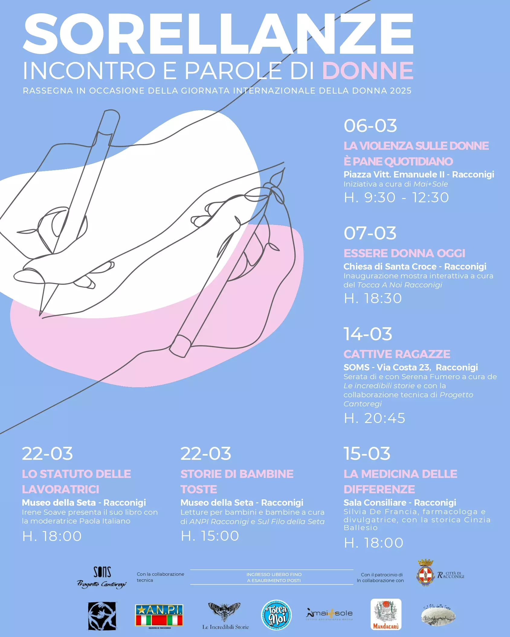 Giovedì 6 marzo a Racconigi parte la rassegna “Sorellanze: incontro e parole di donne”, un ciclo di appuntamenti organizzato in occasione della Giornata della Donna, grazie a una collaborazione tra Comune di Racconigi, associazione Tocca A Noi Racconigi, Mai+Sole, Sul Filo della Seta, ANPI, Progetto Cantoregi, Le Incredibili Storie, Mandacarù e Fondo di Solidarietà.
