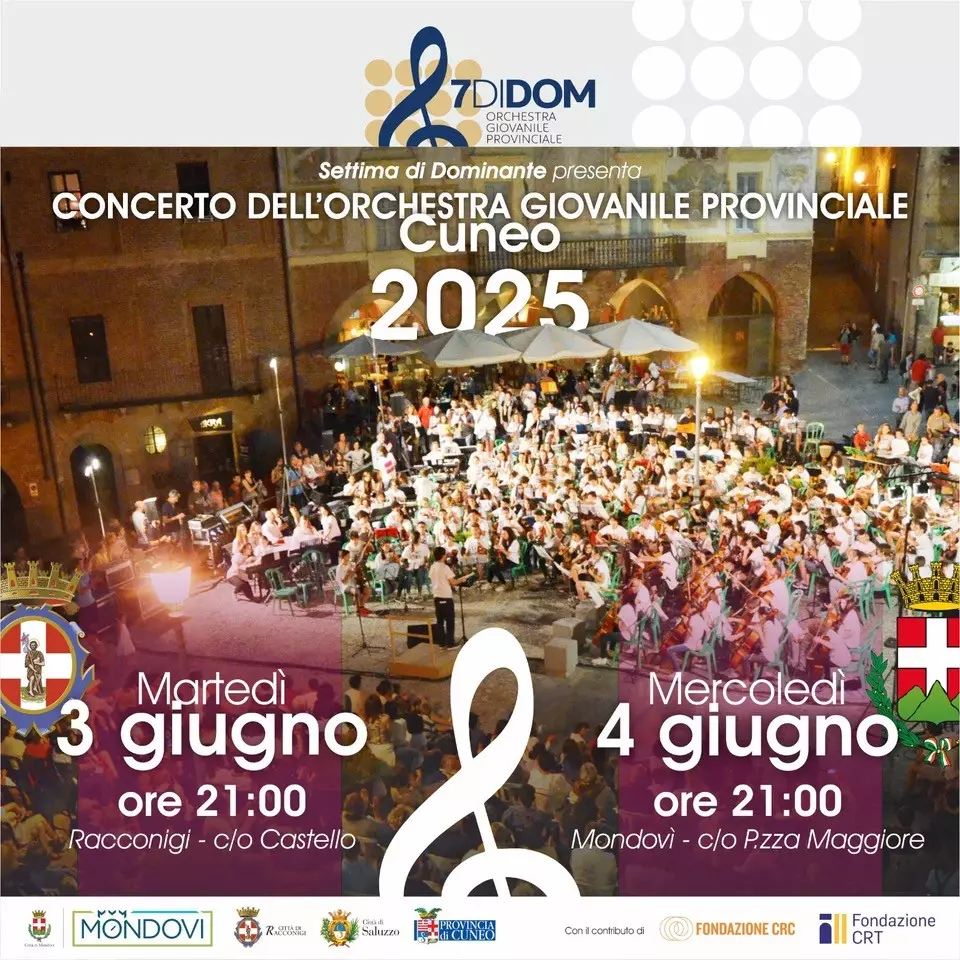 La rete "SETTIMA DI DOMINANTE" - formata da dodici scuole secondarie di primo grado ad indirizzo musicale della provincia di Cuneo - propone anche quest’anno due concerti dell’Orchestra Giovanile Provinciale di Cuneo – 7DiDom - entrambi in orario serale alle ore 21:00.
