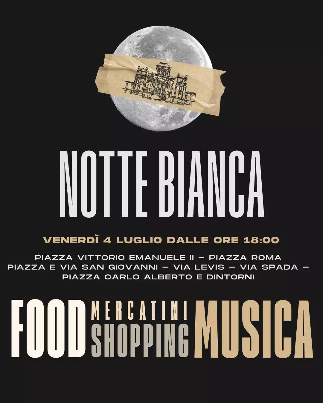 Racconigi si prepara a vivere una serata di festa e aggregazione con la Notte Bianca 2025, in programma venerdì 4 luglio a partire dalle ore 18. L’iniziativa, promossa e organizzata dall’associazione Racconigincentro, porterà musica dal vivo, dj set, street food, mercatini e intrattenimento. I negozi inoltre saranno aperti e i cittadini e visitatori potranno approfittare dei primi saldi della stagione.