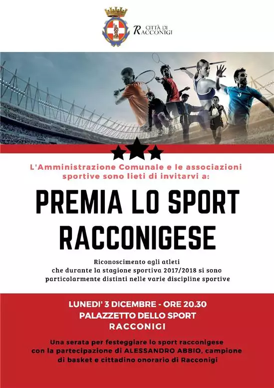Racconigi festeggia lo sport assieme agli atleti delle varie discipline sportive, Lunedì 3 dicembre 2018, presso il Palazzetto dello Sport in via Principessa Mafalda di Savoia , alle ore 20.30, si terrà la prima edizione di “Premia lo Sport”, la festa dello sport racconigese. Un evento importante per festeggiare lo sport come benessere e stile di vita, uno strumento attraverso il quale vivere il proprio agonismo, perché diventi una forma di competizione sana e costruttiva. Lo sport regala emozioni e, attraverso il movimento, si può condividere un obiettivo comune e porsene degli altri, sempre più elevati, per raggiungerli e festeggiarli insieme ai compagni di squadra. Durante la festa, saranno consegnati gli attestati agli atleti che si sono contraddistinti per la tenacia, per la determinazione, per la collaborazione e disponibilità e per i risultati raggiunti. Alla premiazione saranno presenti l’olimpionico Vittorino Milanesio e il campione di basket Alessandro Abbio. Vi aspettiamo a “Premia lo Sport”, la festa dello sport racconigese!