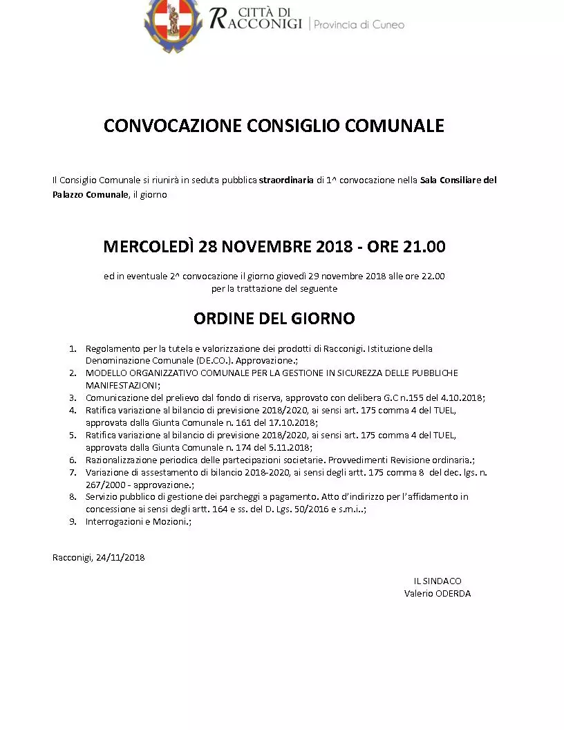 Il Consiglio Comunale si riunirà in seduta pubblica straordinaria di 1^ convocazione nella Sala Consiliare del Palazzo Comunale, il giorno MERCOLEDÌ 28 NOVEMBRE 2018 - ORE 21.00