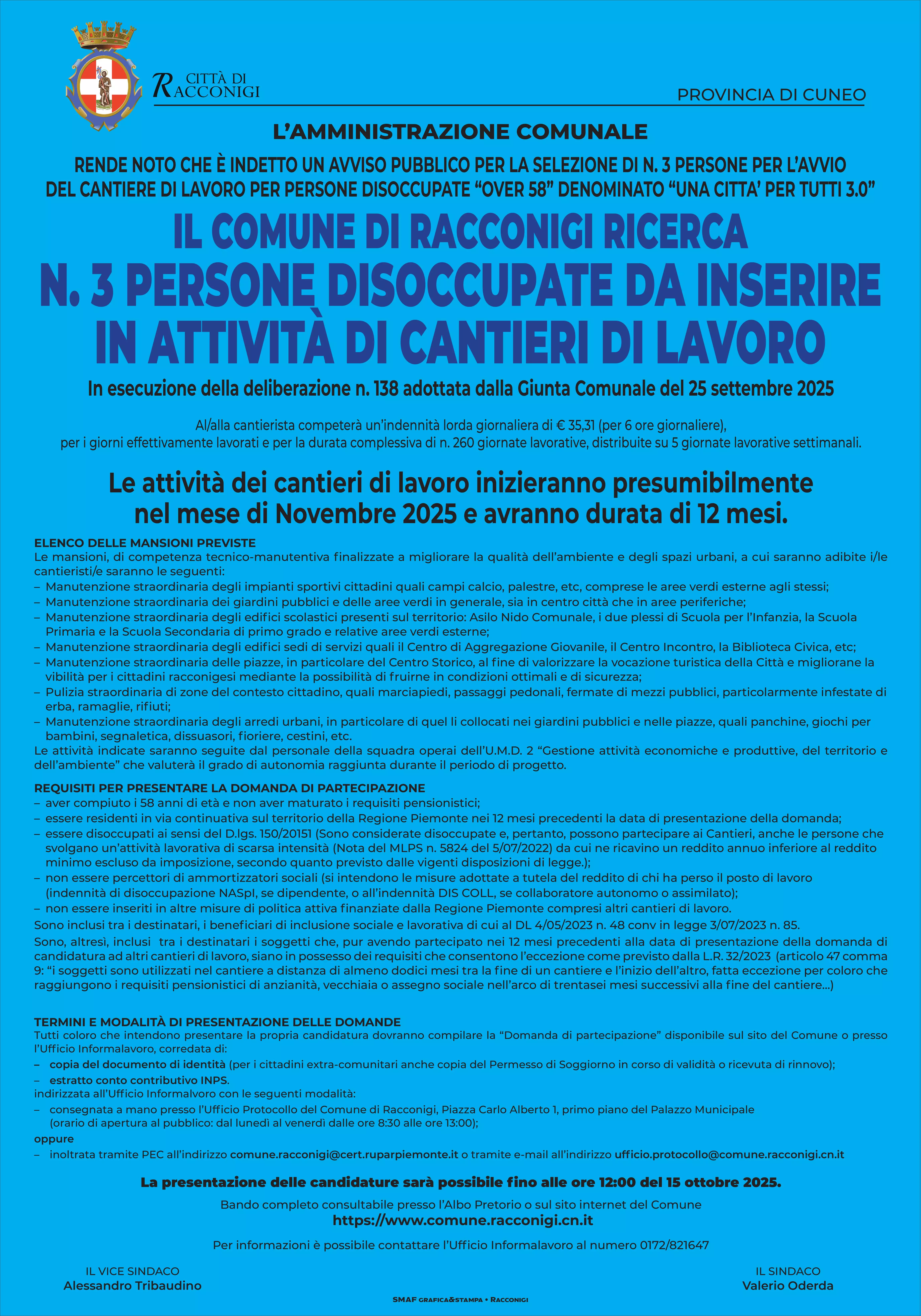 Fino al 15 ottobre 2025 a Racconigi sarà possibile inviare la propria candidatura per partecipare al cantiere di lavoro denominato “Una città per tutti 3.0”. Il progetto, finanziato dalla Regione Piemonte, ha l’obiettivo di ridurre il disagio economico e sociale di persone disoccupate over 58, prive di ammortizzatori sociali e con ridotte possibilità di inserimento nel mondo del lavoro.