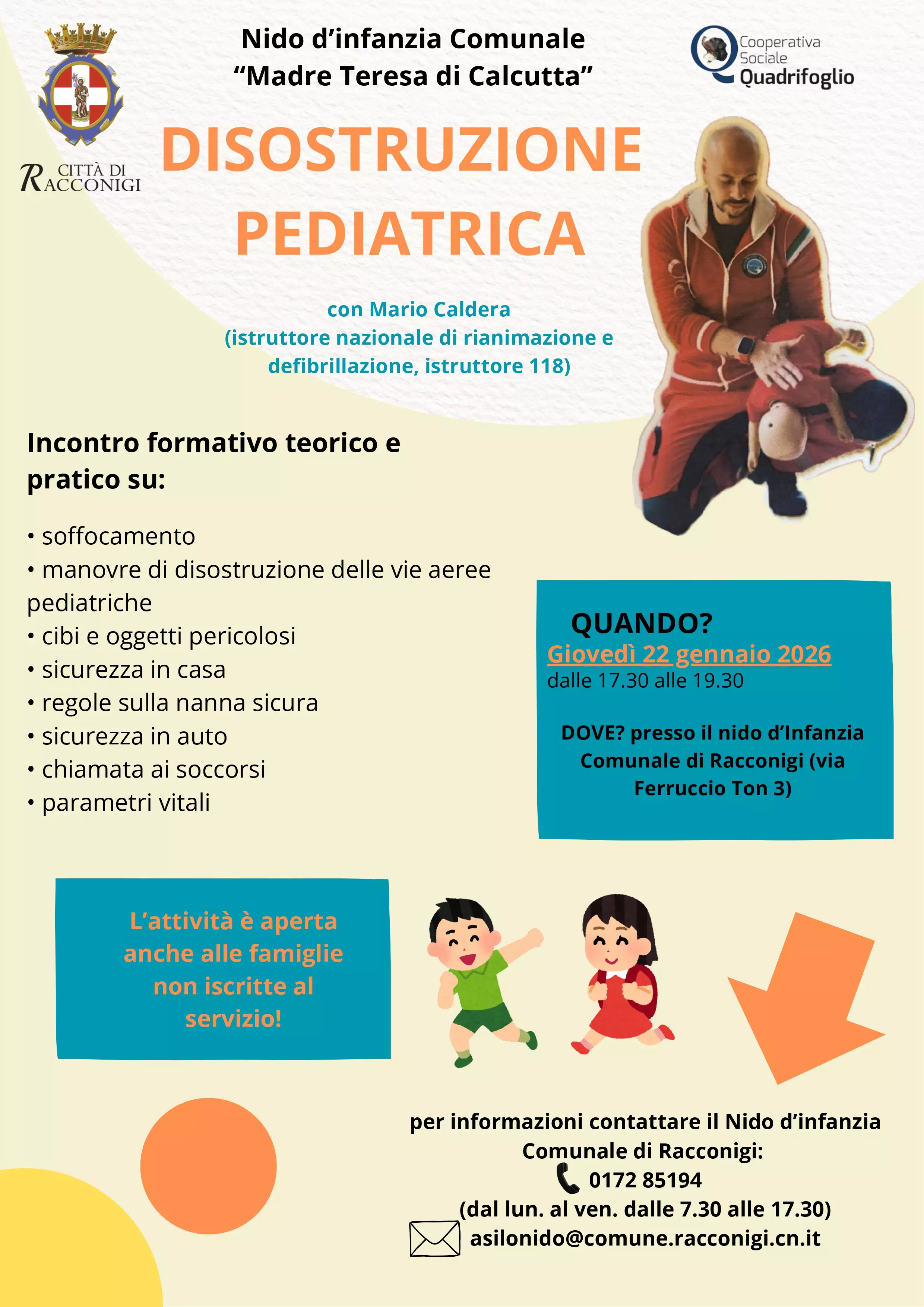 Giovedì 22 gennaio 2026 il Nido d’Infanzia “Madre Teresa di Calcutta” di Racconigi, in collaborazione con la Cooperativa Sociale Quadrifoglio, propone un incontro dedicato alle manovre di disostruzione pediatrica, nell’ambito del progetto “Bimbi Sicuri”. Appuntamento in via Ferruccio Ton 3, dalle ore 17:30 alle ore 19:30.