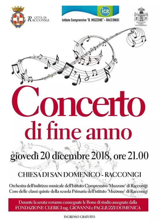 Giovedì 20 dicembre, ore 21, avrà luogo il concerto di fine anno del Corso Musicale dell'istituto 'Muzzone' presso la chiesa di San Domenico, a Racconigi. Sarà un concerto per coro e orchestra e per la prima volta si terrà al di fuori del 'contesto scuola' rappresentato dall'Auditorium comunale sottostante la scuola secondaria dove solitamente si esibiscono gli alunni in vari tipi di performance.