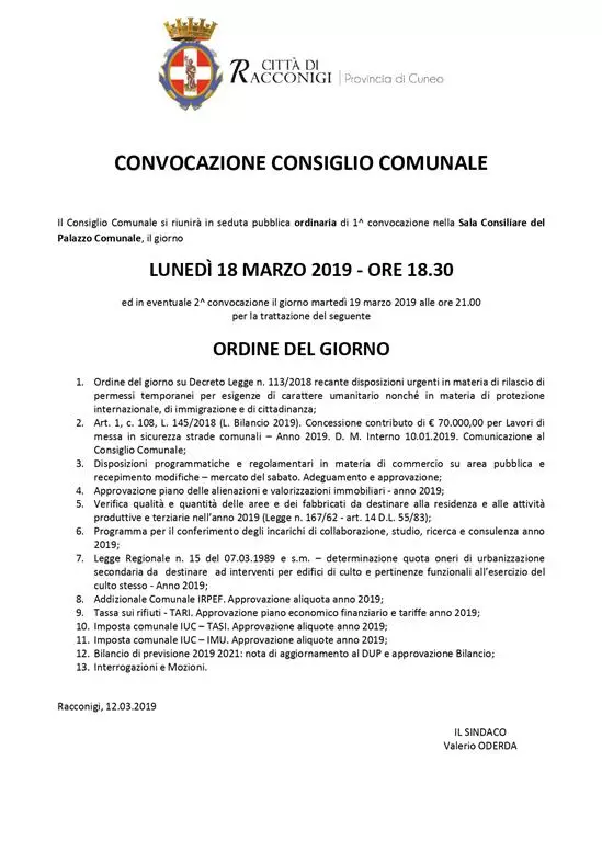 Il Consiglio Comunale si riunirà in seduta pubblica ordinaria di 1^ convocazione nella Sala Consiliare del Palazzo Comunale, il giorno