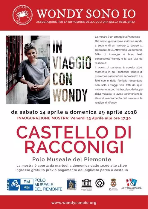 Le sale espositive del Castello di Racconigi ospiteranno “In viaggio con Wondy”, una mostra fotografica omaggio a Francesca Del Rosso, alias Wondy, giornalista e scrittrice scomparsa nel 2016, che per sei anni ha affrontato e raccontato col sorriso e l'ironia il tumore che l'aveva colpita, il suo amore per i viaggi e per la cultura.