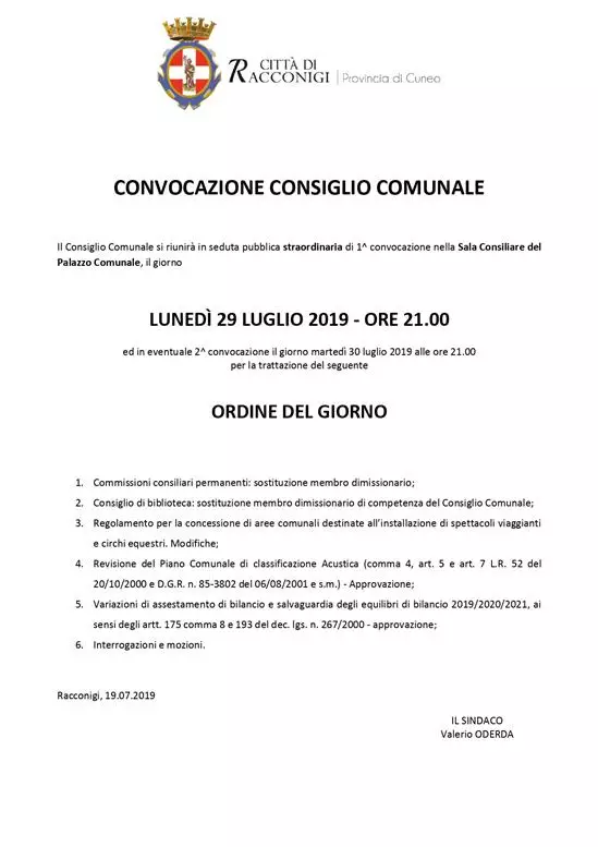 Il Consiglio Comunale si riunirà in seduta pubblica ordinaria di 1^ convocazione nella Sala Consiliare del Palazzo Comunale, il giorno LUNEDÌ 29 LUGLIO 2019 - ORE 21.00 ed in eventuale 2^ convocazione il giorno mercoledì 30 luglio 2019 alle ore 21.00 per la trattazione del seguente