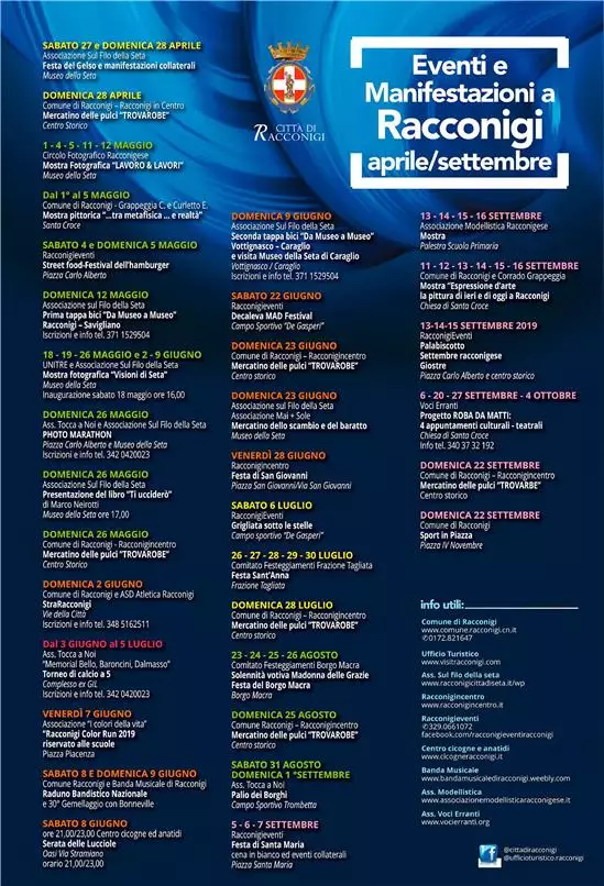 Da questa settimana in tutti i negozi di Racconigi troverete il volantino con tutte le principali manifestazioni che si terranno a Racconigi da fine Aprile a fine Settembre organizzate dal Comune e delle Associazioni Racconigesi. In programma eventi, mostre , feste e molto altro che accompagneranno la città in questi cinque mesi.