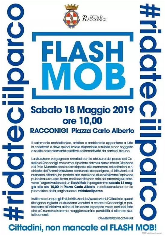La situazione vergognosa creatasi con la chiusura del parco del Castello di Racconigi, che ormai si potrae da mesi senza che la direzione del Polo Museale abbia dato risposte alle numerose sollecitazioni e richieste dell'Amministrazione Comunale Racconigese, di Istituzioni e di numerosi cittadini, ha portato alla decisione di sensibilizzare l'opinione pubblica su questo tema molto sentito non solo dai Racconigesi, attraverso l'organizzazione di un Flash Mob in programma Sabato 10 Maggio 2019 alle ore 10 in Piazza Carlo Alberto, in collaborazione con la promotrice della pagina social #ridateciilparco.