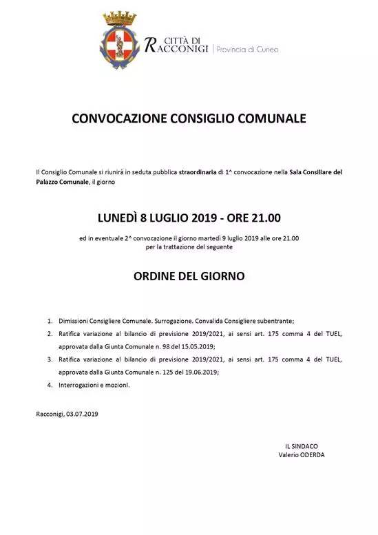 Il Consiglio Comunale si riunirà in seduta pubblica straordinaria di 1^ convocazione nella Sala Consiliare del Palazzo Comunale, il giorno