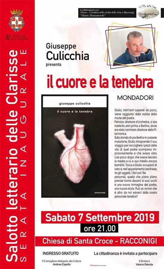 Descrizione Salotto Letterario delle Clarisse - Serata InauguraleSabato 7 settembre ore 21 presso la Chiesa di Santa Croce a RacconigiGiuseppe Culicchia presenta il libro:IL CUORE E LA TENEBRAIngresso gratuito