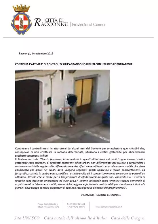 Il Sindaco racconta “Questo fenomeno è aumentato in questi ultimi mesi nei quali troppo spesso i cestini gettacarte sono stracolmi di sacchetti contenenti rifiuti urbani non differenziati: per riuscire a sorprendere i contravventori delle regole sulla differenziazione dei rifiuti viene utilizzata una telecamera mobile che viene posizionata per giorni nei luoghi dove vengono segnalati questi spiacevoli e incivili comportamenti. La fotografia, scattata in centro paese, certifica l’attività svolta ed il comportamento da censurare da parte di un cittadino. Ricordo che le multe per il Conferimento di rifiuti diversi da quelli cui i contenitori o i sistemi di raccolta sono destinati ammontano ad euro 181,67. Stiamo valutando come Amministrazione comunale di acquistare altre telecamere mobili, economiche, leggere e facilmente posizionabili per monitorare i Viali ed i giardini dove troppo spesso i proprietari di cani non raccolgono le deiezioni dei propri animali”.