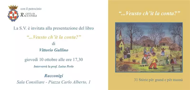 Descrizione Giovedì 10 ottobre alle ore 17.30Sala Consiliare del Palazzo Comunale in Piazza Carlo Alberto 1Presentazione del libro: “...Veusto ch’it la conta?”di Vittorio GullinoInterverrà la professoressa Luisa PerloIngresso gratuito