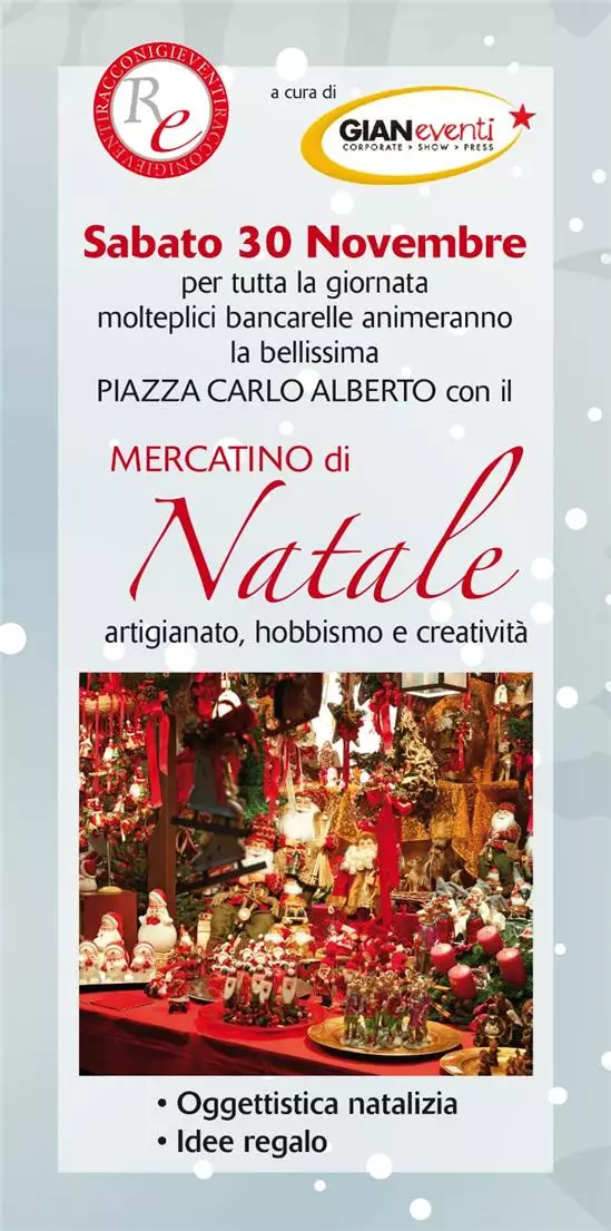 Descrizione Sabato 30 novembreper tutta la giornatamolteplici bancarelle animerannola bellissimaPIAZZA CARLO ALBERTO con il MERCATINO di NATALEartigianato, hobbismo e creatività