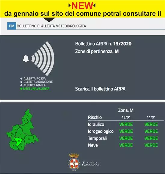 Dalla seconda metà di dicembre 2019 è stato inserito sul sito del Comune di Racconigi www.comune.racconigi.cn.it (nella parte inferiore della home page) il BOLLETTINO DI ALLERTA METEOIDROLOGICA che contiene una previsione dei fenomeni meteorologici e degli effetti al suolo attesi per il rischio idrogeologico ed idraulico, differenziati per zone di allerta.