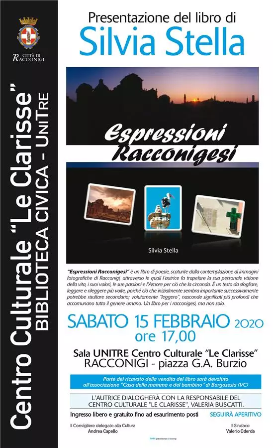 "Espressioni Racconigesi" è un libro di poesie, scaturite dalla contemplazione di immagini fotografiche di Racconigi, attraverso le quali l'autrice fa trapelare la sua personale visione della vita, i suoi valori, le sue passioni e l'Amore per ciò che ci circonda