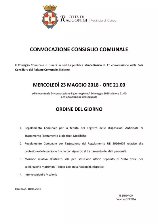 Consiliare del Palazzo Comunale, il giorno MERCOLEDÌ 23 MAGGIO 2018 - ORE 21.00