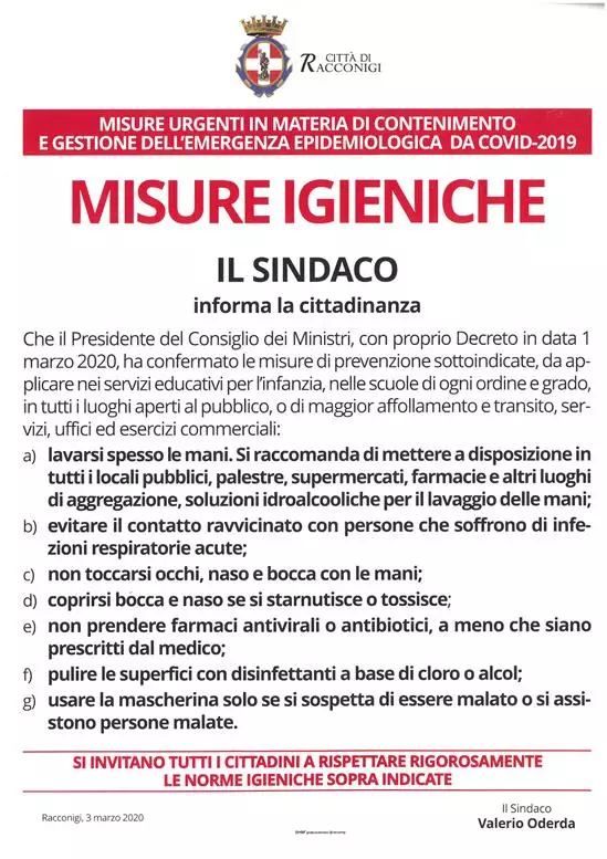 che il Presidente del Consiglio dei Ministri, con proprio Decreto in data 1 marzo 2020, ha confermato le misure di prevenzione sotto indicate, da applicare nei servizi educativi per l'infanzia, nelle scuole di ogni ordine e grado, in tutti i luogji aperti al pubblico, o di maggior affollamento e transito, sevizi, uffici e esercizi commerciali: