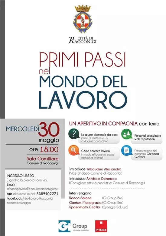 Secondo appuntamento con gli info-aperitivi del ciclo: PRIMI PASSI NEL MONDO DEL LAVORO. Mercoledì 30 MAGGIO alle ore 18.00 presso la Sala Consiliare del Comune di Racconigi in Piazza Carlo Alberto 1 si svolgerà un incontro sul mondo del lavoro organizzato dal Consigliere alle Attività Produttive Domenico Annibale e dal Vice Sindaco Alessandro Tribaudino. L’incontro è aperto a tutti e ha lo scopo di dare ai partecipanti strumenti, idee, suggerimenti, consigli pratici da ‘portare a casa’ e da utilizzare subito per migliorare la propria situazione lavorativa. Le relatrici, Serena Racca, responsabile Gi Group di Bra e Cecilia Spampinato, responsabile Synergie Saluzzo e Mariagrazia Gautieri avranno la possibilità di affrontare gli argomenti dal proprio punto di vista e di confrontarsi con il pubblico, in un ambiente informale, conviviale e stimolante.
