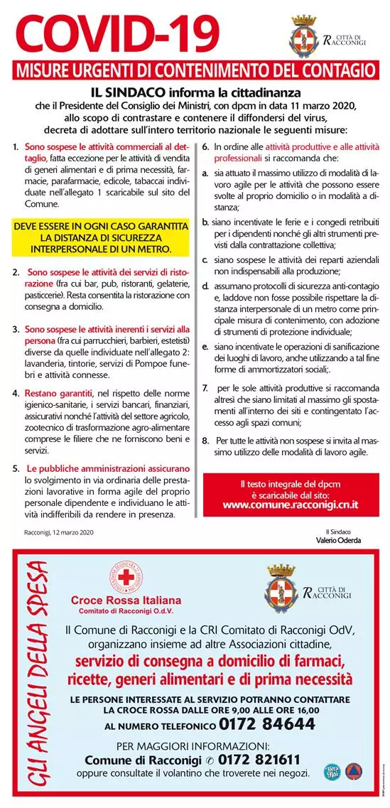 Il Sindaco informa la cittadinanza che il Presidente del Consiglio dei Ministri, con dpcm in data 11 marzo 2020, allo scopo di contrastare e contenere il diffondersi del virus, decreta di adottare sull'intero territorio nazionale le seguenti misure: