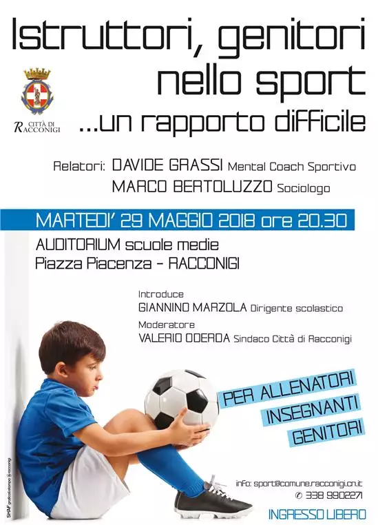 Una serata a cui allenatori, genitori, dirigenti e insegnanti non possono assolutamente mancare, martedì 29 maggio alle ore 20.30, nell’Auditorium delle scuole medie in piazza Piacenza a Racconigi si svolgerà l’incontro “Istruttori, genitori nello sport… un rapporto diffcile”.