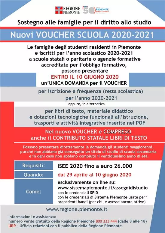 Da oggi si possono inviare le domande on line per partecipare al bando per il #voucherscuola della Regione Piemonte per l'anno scolastico 2020/2021.