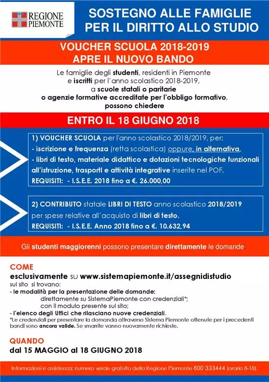 Si comunica che la Regione Piemonte ha aperto il bando per aiuti economici alle famiglie residenti nella Regione Piemonte, per il diritto allo studio, relativamente all’anno scolastico 2018/2019