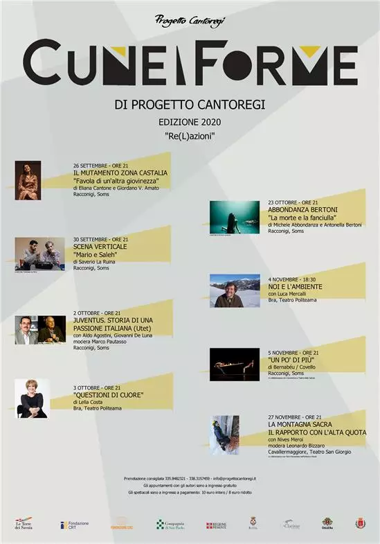 Una nuova rassegna di appuntamenti culturali abbraccia le terre del cuneese, tra letteratura, teatro, danza, musica, arti visive e sport, per offrire nuove occasioni di conoscenza e riflessione sul mondo contemporaneo. Da settembre prende il via CuneiForme, ideato e organizzato da Progetto Cantoregi, che si presenta all’insegna della pluralità: più discipline e linguaggi artistici contemplati, più luoghi attraversati, più varietà nella scelta degli ospiti, più punti di vista per riflettere su un tema che varia di anno in anno, più soggetti pubblici e privati coinvolti.