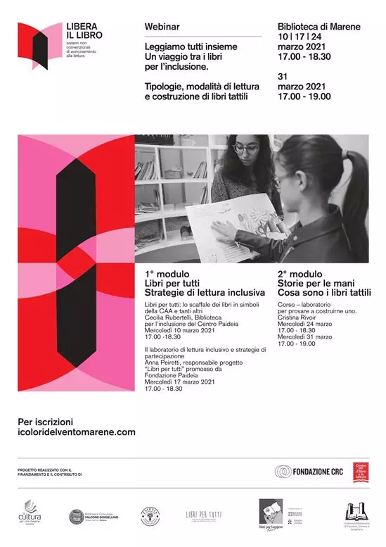 Il corso verrà organizzato interamente online sulla piattaforma Google Meet messa a disposizione dalla Biblioteca di Marene. Si inizierà con l’incontro di mercoledì 10 marzo dalle 17.00 alle 18.30 e proseguirà i successivi mercoledì 17 marzo e 24 marzo, concludendo con il laboratorio per costruire il proprio libro tattile programmato nel pomeriggio di mercoledì 31 marzo dalle 17.00 alle 19.00.