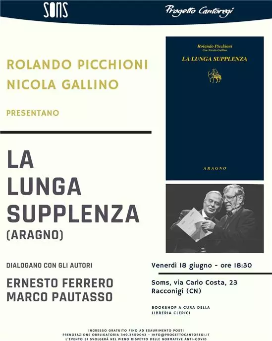 Venerdì 18 giugno 2021 alle ore 18.30 alla Soms di Progetto Cantoregi (Via Costa 23, Racconigi) Rolando Picchioni presenta il libro “La lunga supplenza”, scritto insieme con Nicola Gallino e pubblicato da Nino Aragano editore. Dialogheranno con gli autori lo scrittore Ernesto Ferrero, direttore fino al 2016 del Salone Internazionale del Libro di Torino, e Marco Pautasso, presidente di Progetto Cantoregi e vicediretore del Salone Internazionale del Libro di Torino.