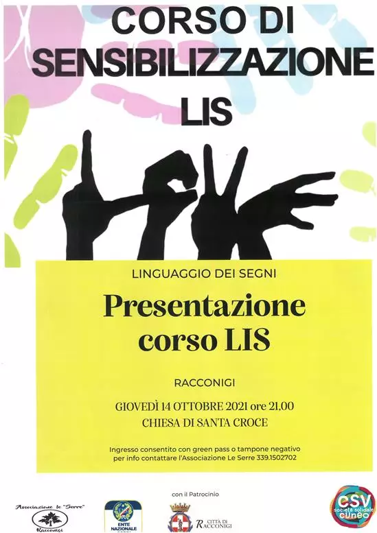 Descrizione CORSO DI SENSIBILIZZAZIONE LIS Linguaggio dei segniPresentazione corso LisGiovedì 14 ottobre ore 21Chiesa di Santa CroceIngresso consentito con green pass o tampone negativoper informazioni contattare l'Associazione Le Serre 3391502702