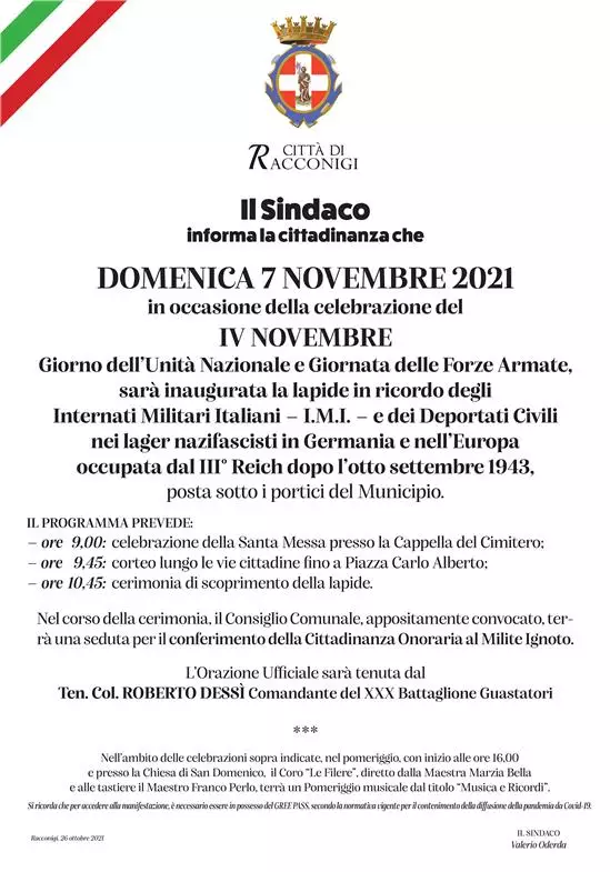 Nel corso della cerimonia, il Consiglio Comunale, appositamente convocato, terrà una seduta per il conferimento della Cittadinanza Onoraria al Milite Ignoto.