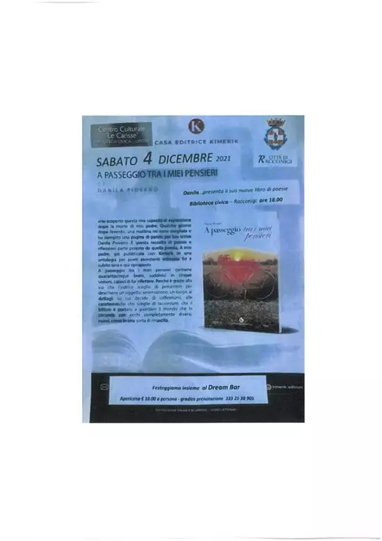 < "Ho scoperto questa mia capacità di espressione dopo la morte di mio padre. Qualche giorno dopo l'evento, una mattina mi sono svegliata e ho riempito una pagina d parole per lui" scrive Danila Piovano. E questa raccolta di poesie e riflessioni parte proprio da quella poesia, A mio padre, già pubblicata con Kimerik in una antologia per poeti esordienti intitolata Ed è subito sera e qui riproposta. A passeggio tra i miei pensieri contiene quarantacinque brani, suddivisi in cinque sezioni, capaci di far riflettere. Perché è grazie alla via che l'autrice sceglie di percorrere per descrivere un oggetto, un'emozione, un luogo, ai dettagli su cui decide di soffermarsi, alle caratteristiche che sceglie di raccontare, che il lettore è portato a guardare il mondo che lo circonda con occhi completamente diversi, nuovi, come una sorta di rinascita. >